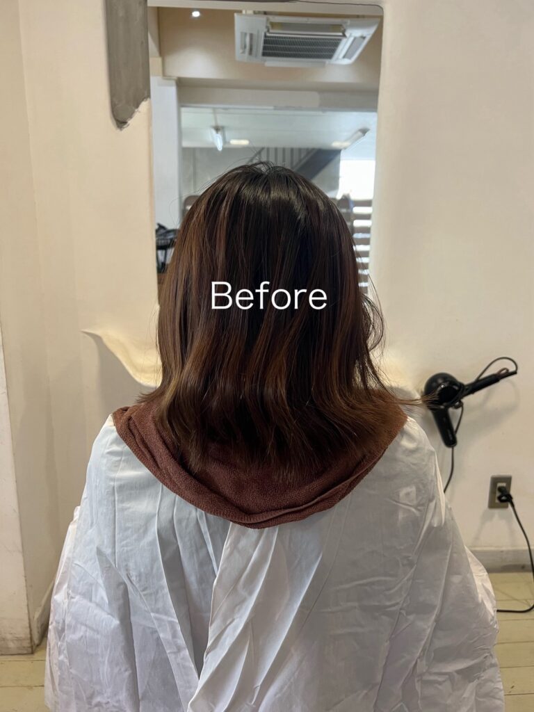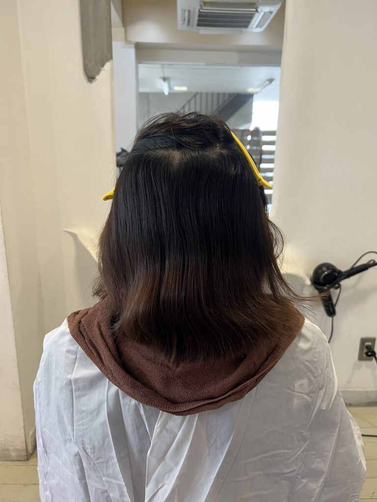 細い髪質なので、ダメージに気をつけながらと癖にしっかりとアプローチをかけて縮毛矯正で髪質をチェンジしていきます。